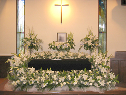 左)葬儀式場でのキリスト教葬儀 千日谷会堂(約200名席)